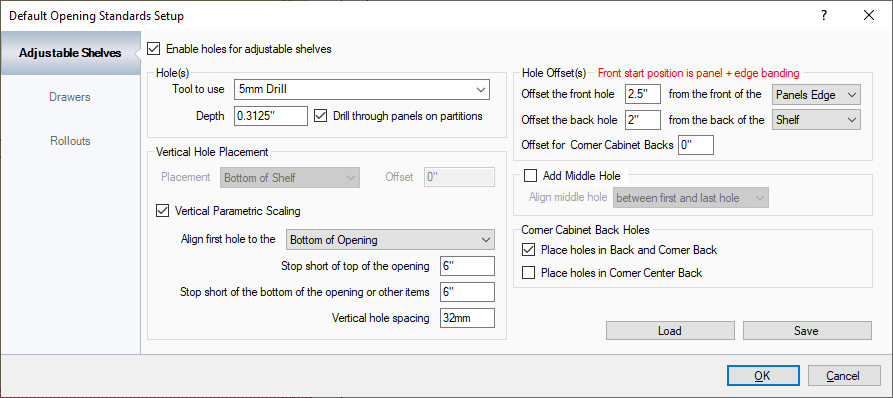 Add Middle Hole: If a middle hole is needed, place a check mark. The middle hole can be aligned between the first and last hole or to the middle of the shelf.