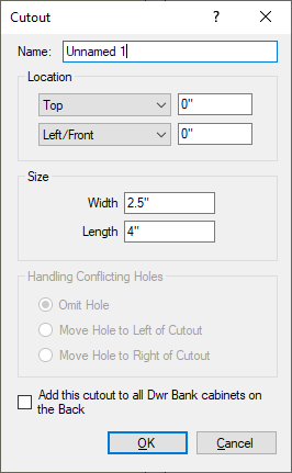 This section displays and allows custom cutouts to be created for the currently displayed part only. A good example of use for creating a custom cutout would be to add a hole to allow wiring through on a Computer Desk. Remember, this only creates a square hole, not a round one.