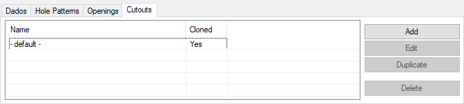 - Name: This section displays cutout names. If the cutout is added on this tab using the methods below, they name will be set to whatever is in the Name field on the custom cutout screen. Cutouts that are created by default from the Options section in the Tools menu will be named "- default -" since there is no way to currently name the default ones.