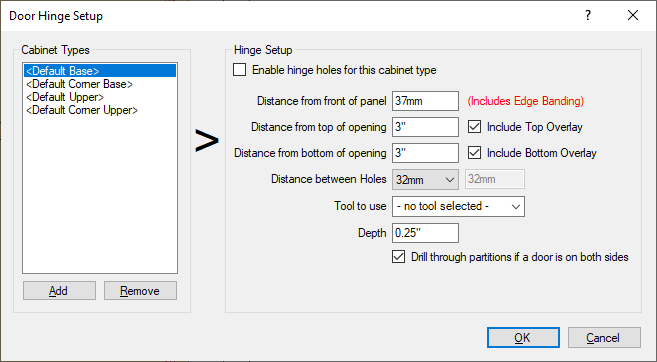 Cabinet Types: This shows the cabinets or cabinet types to set hinge holes on. The default is all Bases, Corner Bases, Uppers or Corner Uppers can be set up or just individual cabinet types like just sinks, pantries, etc can be set for hinge holes. Distance From Front of Panel (Includes Edge Banding): This sets the distance from the front of the panel, INCLUDING edge banding. By default the distance is set to 37mm. Distance From Top of Opening: This sets the distance from the top of the opening to the center point of the 2 hinge holes.