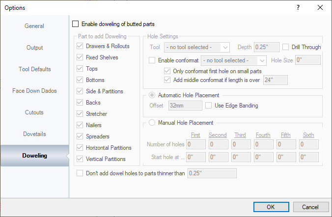 This section sets up dowel holes for butt jointed parts only. Parts to add Doweling: This specifies which parts get dowel holes added to. Hole Settings: This section sets up which tool to cut the dowel holes with, including depth and drill through. Conformat settings are also set in this section since they are a different size than a normal dowel hole usually. Normally conformat holes are first and last hole in a line but if the part is over a set distance, a middle conformat hole can be added. Automatic Hole Placement: This sets up a line bore at whatever office distance is specified. That distance is 32mm by default. Manual Hole Placement: This section is a bit more custom and applies to ALL PARTS that are enabled for doweling.