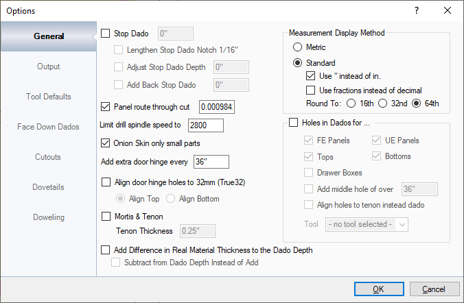 This section sets the general options that set up the entire program. Stop Dado: This doesn't change the size of the part that goes into that dado, this creates a notch in the part that fits into the dado by whatever value that is set. This is normally for Euro style cabinets to so Edge Banding machines can smoothly edge band a part without damaging the part or machine. It is also recommended for the Mortis & Tenon joint.