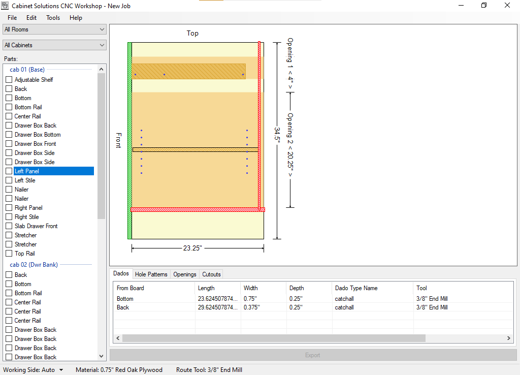 - Customize Cabinet Information: Like Cabinet Solutions, individual items can be singled out and customized away from the rest. The information displayed are Dados, Hole Patterns, Openings, and Cutouts.