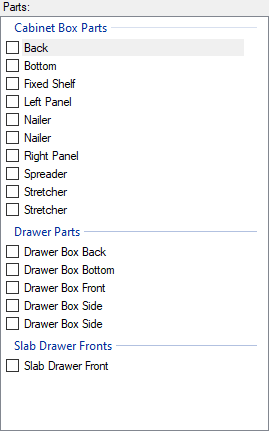 The parts section displays the different parts in the cabinets that have been imported from the Designer. On this screen, parts can be displayed on the main page by clicking on the name of the part itself, or the parts can be selected for exporting to EnRoute by placing a check mark next to the part. |