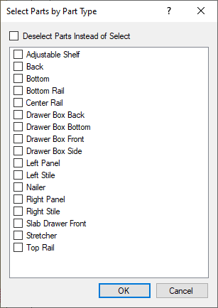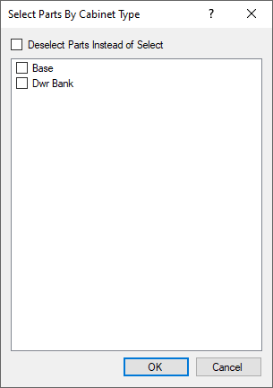Select by Cabinet Type: This will bring up a window that displays all cabinet types that are in the current job. At the top of the window is an option to De-Select instead of Select. To use this, click on it and then whatever parts of the cabinet types you already have selected will be de-selected from the list of selected items.