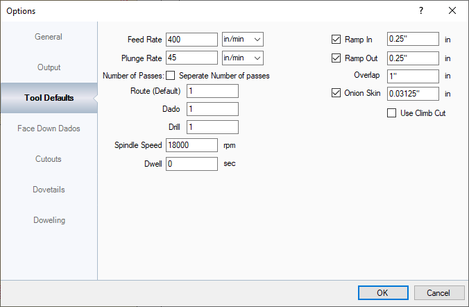 This section sets up the default information that appears on the Materials and Tools Settings section of the program. Since the information on that screen has to have a default starting point before it can be customized per tool, per material, this is where it is set up. It is suggested that this is the fastest that you push your smallest bit through thick material on this section. |