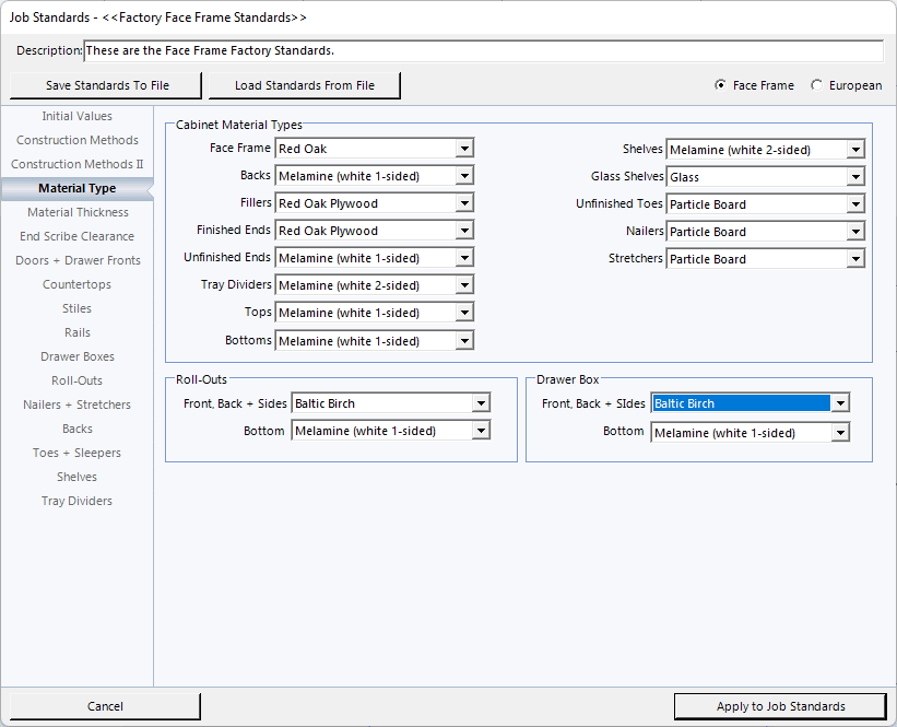 In the Material Type section, specify the materials you will use for each of the cabinet parts. Material types can be specified for entire jobs but you can also change specifications for individual cabinets within a job.