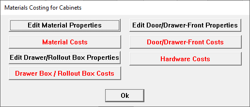 - "Edit Door/Drawer Front Properties": This button opens a dialog box in which you can input your cost for each door/drawer front type you will be using.