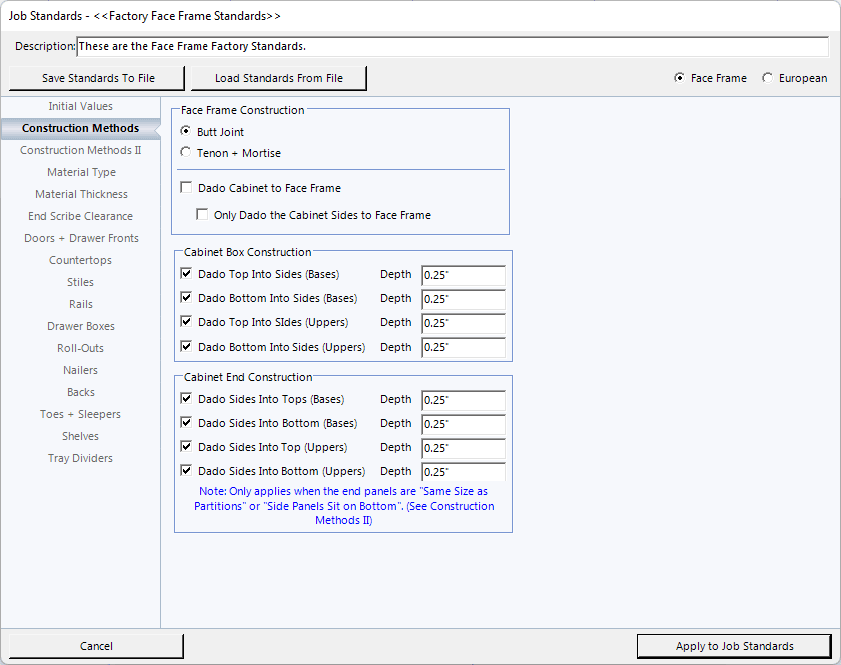 The first thing we want to establish is how you will be assembling your cabinets. If you use dado construction, there are places to put the depth of each dado. If you dowel or butt joint and screw your box parts simply turn off the dado box.
