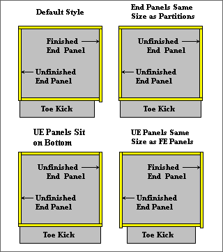 - Default: If you sandwich your top and bottom panels between your end panels and your unfinished end panels come down to the bottom of your cabinet bottom, then click this radio button.