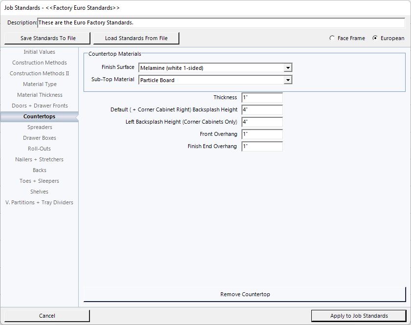 Although Cabinet Solutions does not currently produce a cut list for counter tops, the information that you place in these standards will be used for both your presentation pictures, and also for your job costing of counter tops.