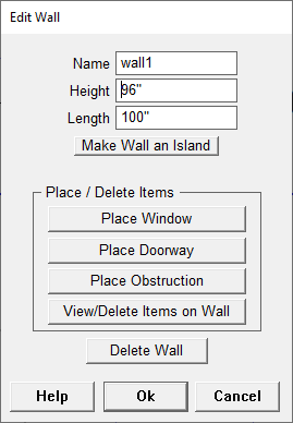- Now move your mouse cursor into the drawing screen. As you move your mouse around you will notice that the wall that the mouse is closest to will change colors or "highlight". Click the mouse when the wall that you wish to edit is highlighted. An edit window will appear with the following wall edit options available.