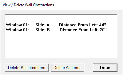 - Note: There are two sides to every item. Side A and side B. Items such as windows and doors can be seen on both sides. Items such as obstructions (light switches, electrical outlets, etc.) might only be seen on one side, so here you can delete the side you don't want. The "Distance From Left:" will help you determine which side to delete. This assumes you are looking at the wall head on.