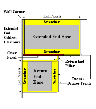 - Return End Filler (base): This filler allows you to create a corner space in a base blind corner situation. This is needed so that doors and drawer fronts aren't bumping and binding with each other in the corners. Enter the size of the filler you want between your return end base cabinet and the extended end base cabinet, (blind corner cabinet).