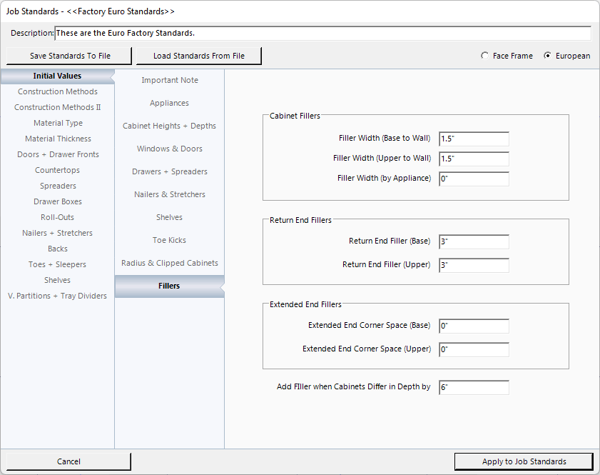 In this section, you specify the size of fillers in the different situations you will find yourself in. These fillers will be automatically placed in for you when you place your cabinets. Note: If you set a filler size to 0", no filler will be placed in that situation.