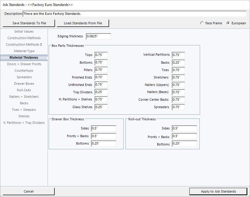 - Backs: Enter the thickness of your back material. If you are not using backs in this particular job you can leave them out in the standards for backs. You may still leave your standard back thickness.