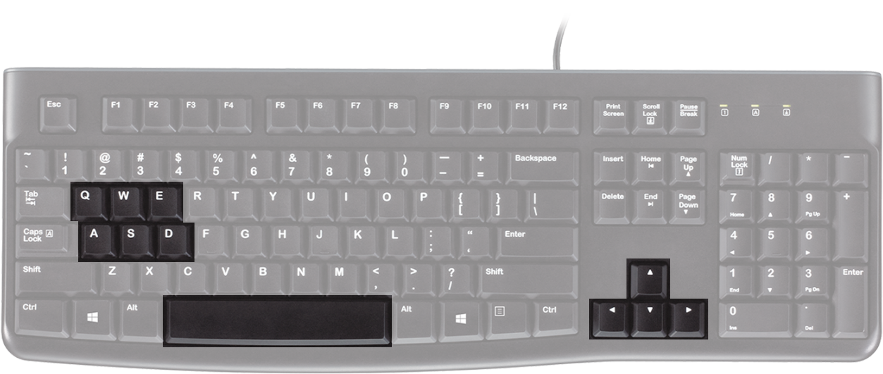 Each key or key combination described below will continue to move the camera around the room until the key or keys are released. The highlighted keys on the image below are the ones that are used in our software. Below them are the descriptions of what they do: