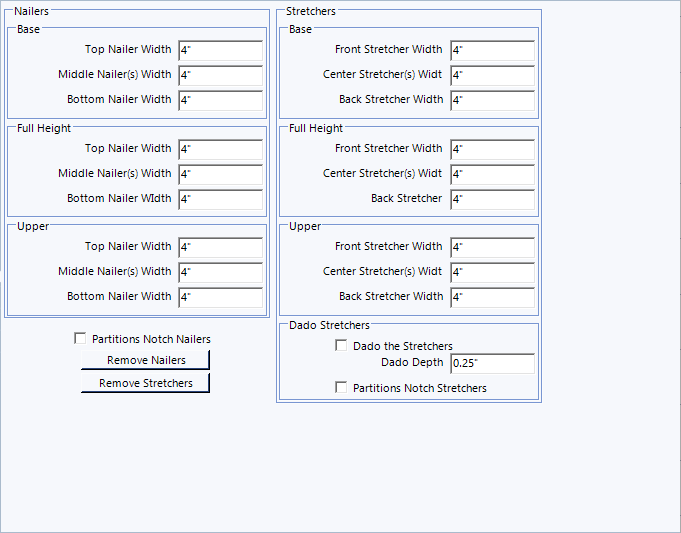 In this section you enter specifications regarding nailers and stretchers. Nailers refer to the structural pieces of the cabinet that fasten it to the wall. Stretchers refer to the structural pieces in the tops of the cabinets that replace the tops. The thickness of nailers and stretchers is entered into the "Material Thickness" standards window. The program determines their overall lengths based on your construction methods. In this section you will need to enter the width of the nailers and stretchers when they are in different positions. For some of you the widths will all be the same. Please fill out all the entry fields.