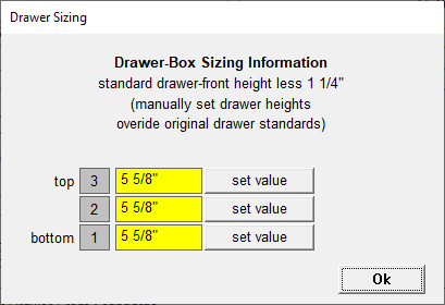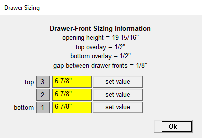 In the new dialog box that opens, click the "set value" button of the bottom drawer (notice that the corresponding edit field changes from yellow to white and the button you just clicked is now labeled "done". In the white edit field, type in the new size you want the drawer-front to be, then click the button whose label just changed to "done".