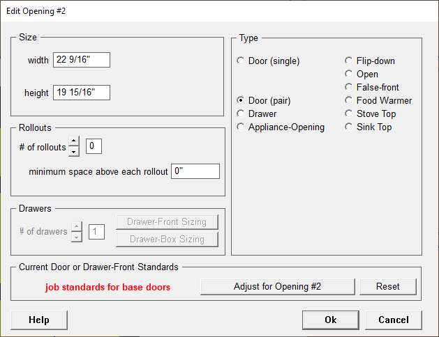 Whenever you select to cover an opening with a door, a pair of doors or a drawer-front, you can adjust the standards used on that door or drawer-front. This feature gives you the ability to change the door style on one opening in a cabinet to be different than the door style on a different opening in a cabinet. Just as an example, you may be building an entertainment center with solid raise panel doors on it. There maybe one section though, that needs glass doors on it. Use this feature to make that adjustment. Click on the "Adjust for Opening #__" button. If you decide you want the opening to revert back to the door style set in your Job Standards, click the button labeled "reset".