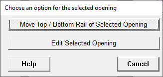 This dialog box gives you 2 options. The bottom button, "Edit Selected Opening", will take you to the "Edit Opening" dialog box just described. The top button, "Move Top / Bottom Rail of Selected Opening", opens a dialog box in which you can move the bottom rail or the top rail of a section. Simply enter the distance from the top or the distance from the bottom that you want to move the rail.