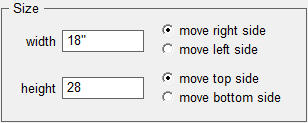 To change the size of the opening (i.e. its height or its width), find the Height or Width entry field and type in the size you want the opening to be. This can only be done if you are moving parts that can be moved without affecting the overall cabinet size. For example, you can move a center rail that sits between the top drawer in a cabinet and the door below it, but you can't move the top rail above the top drawer in that cabinet since to move that top rail actually makes the cabinet taller. To move that top rail, you have to resize the entire cabinet.Note: The program needs to know which side of the opening to move: Left or Right, Top or Bottom. Click on the radio button indicating which side of the opening you want moved.