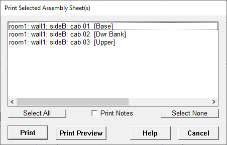 This window will allow you to select individual or multiple Assembly Sheets to print. This is the same information that you would see from the Assembly Sheet on the Custom Cabinet screen.