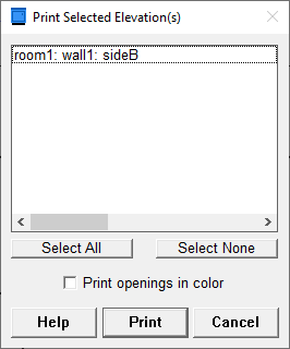 When you print the Wall Elevations screen, you can select which walls that have cabinets on them to print out the elevations on. The views will only be walls that have cabinets on and only the sides that have cabinets on them. Cabinet Solutions labels these walls as Side A and Side B in case there are cabinets on both sides of the wall.