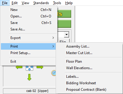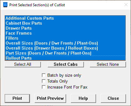 The Master Cut List allows you to view the cut sizes of individual parts and gives you a list of parts for either individual cabinets by going through Select Cabs, or for all cabinets in the job by default.