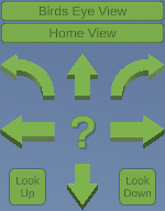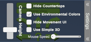 Birds Eye View: This view gives a Birds Eye View of the job currently being displayed. What this means is the camera is raised up high and then rotated down to look at the job file. If more height is needed, click on the Settings tab and the camera can be raised even higher. NOTE: RAISING THE CAMERA UP EVEN HIGHER MAY NOT DISPLAY THE ENTIRE KITCHEN. Home View: This button will reset the camera to the initial settings as if just opening the job. If the camera is not displaying any thing when the Home View button is pressed, the camera will have to be manually lowered to a normal height from the Settings tab. NOTE: IF THE CAMERA IS MANUALLY RAISED HIGHER THAN THE AMOUNT FROM THE BIRDS EYE BUTTON, WHEN CLICKING ON HOME VIEW, THE CAMERA WILL STILL BE RAISED AND NEEDS TO BE MANUALLY LOWERED FROM THE SLIDER ON THE SETTINGS TAB. Direction buttons are covered in the Moving Around the Tour section. |
