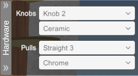 This section changes the types of hardware displayed for knobs and pulls. We have different knob and pull types and color options that can be selected from the drop down list. |