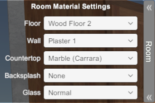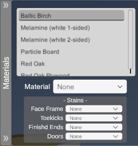 This section is where non-cabinet materials are set. When a material is set from the drop down box, the item that was changed immediately updates. |