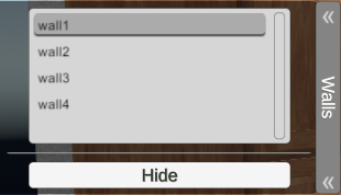 This allows walls to be hidden temporarily. To hide walls, click on the wall that needs to be hidden from the walls on the list and then click on Hide to hide the wall. More than one wall at a time can be hidden, but they do need to be hidden one at a time. To bring a wall back, click on the wall that was hidden on the list and then click on Show to display the wall again. Please note, pressing ESC to close out of the Tour and opening it back up will cause all of the walls to be visible again. |