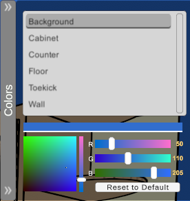 This section appears with the "Use Flat Legacy 3D" option enabled in the Settings panel and replaces the Materials panel. This allows the colors to be changed for each section in the tour; Background, Cabinet, Counter, Floor, Toe Kick and Wall. Reset to Default: To reset items to their default colors on the Legacy view, click on each one of the sections one at a time and click on Reset to Default. |