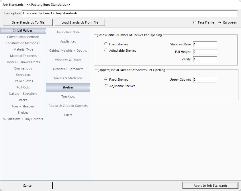 The number of shelves per opening, and whether those shelves are fixed or adjustable, is an initial value only. You will be able to change the number of shelves at the time each cabinet is placed. There are also instructions in Edit Elevations on how to change the number, and type of shelves in a cabinet after it has been placed. To get the best results, just enter typical values in these standards.