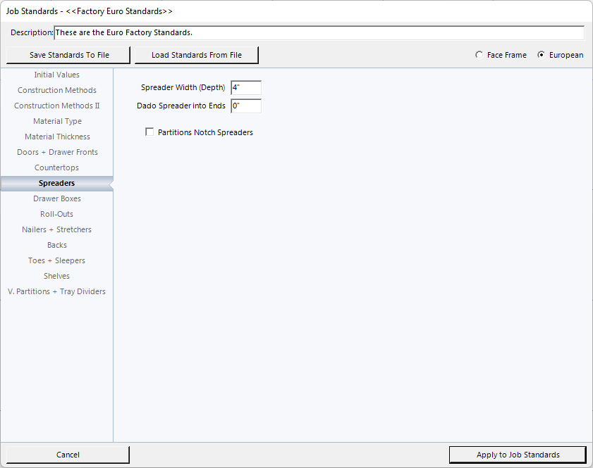 If you are using Euro construction for your cabinets, the standards for stiles and rails are replaced with a standards window for spreaders. In Cabinet Solutions, spreaders are horizontal pieces that are placed between the top drawer of a base cabinet and the doors below or between drawers.