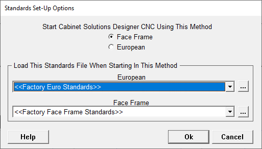 This window has 2 important features. You can tell the software which setting you want to start a new job in by default, Face Frame or European style of standards and you can tell the software what set of saved standards to use for each of those styles of standards.