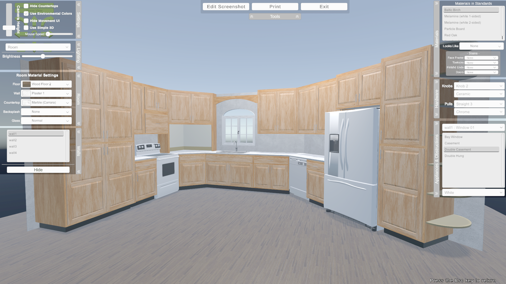 This screen is a 3D view of the current job being worked on. Unlike this image, this is not a static image. You will be able to move around the job in real time with your client next to you to give them a virtual walk through of their job. Other items on this section control are camera heights, brightness, appliance models, hardware and materials.