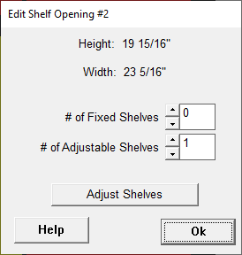 - A new dialog box will appear. Type in the number of fixed and /or adjustable shelves you want in the opening.