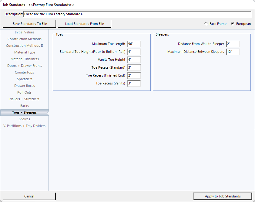 In this section you enter toe heights for standard cabinets and vanities. Your toe height can vary in height and depth of recess, you can even eliminate it and place your base face frame directly on the floor.