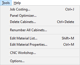 The Tools menu has different features that are included in with your Cabinet Solutions software to make things easier such as Job Costing, Panel Optimzing and more.