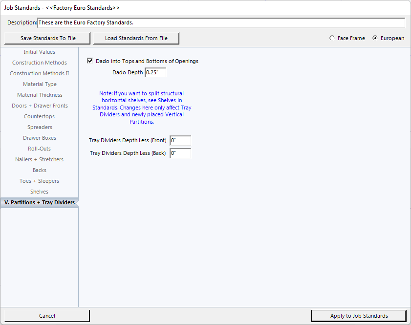 The standards section for "Tray Dividers" is labeled Tray Dividers when you are building face frame cabinets and is labeled V. Partitions + Tray Dividers in Euro.