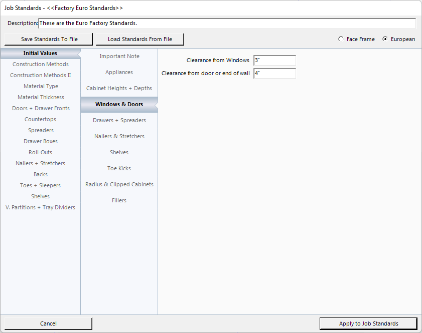 These dimensions were put into Cabinet Solutions to help prevent a cabinet maker from making a mistake. These values will keep cabinets away from doors and windows so that the door or window trim won't run into your cabinets. If you account for the door and window trim in another manner, set these standards to 0" and they won't affect your design. If you want to use this safeguard, Cabinet Solutions will never place a cabinet closer than the size you put in these entry fields. Because this is an initial value, Cabinet Solutions only uses this information when a cabinet is placed. Therefore, you can change the sizes in this window for every cabinet placed next to a door or window and the cabinets will all be different distances away from the door or window.