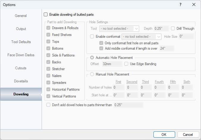 Doweling can be set up in the Workshop to fit any butt jointed parts. You can set up a line bore pattern for them or set up custom distances that will fit any dowel machine. If the dowel holes are longer than the part, the software ignores them so parts don't get doweled by mistake.