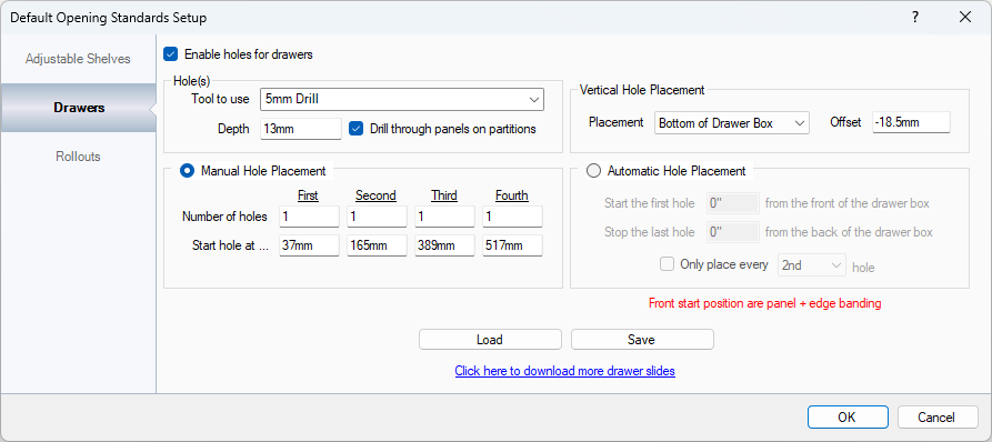 With the various types of drawer slides on the market today, we have several templates available from Blum, Salice, Vitus and more. You can create your own hole pattern templates as needed or if a type you are looking for isn't listed and you'd like one to be made, send the spec sheet over to Tech Support and we can generate one for you. Keep in mind that all of the slides we have listed are to manufacturer specifications.